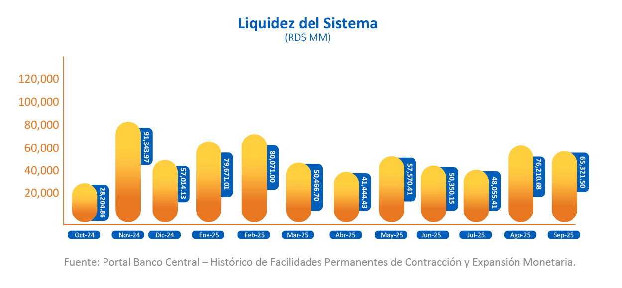 Durante el mes de septiembre, la liquidez en pesos del sistema disminuyó en un 14.29%, con respecto al cierre de agosto, terminando en RD$65,321.50MM.