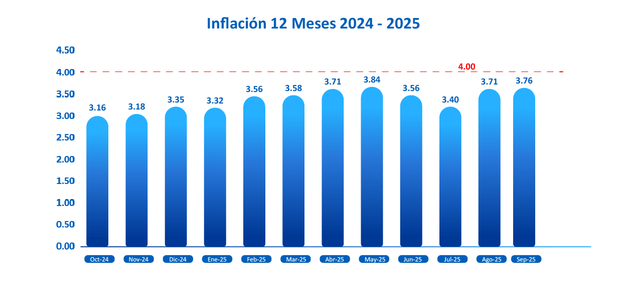 Según datos del Banco Central, la inflación interanual medida desde septiembre 2024 hasta septiembre 2025 asciende a 3.76%, manteniéndose dentro del rango meta establecido de 4.00% +/- 1.00%.