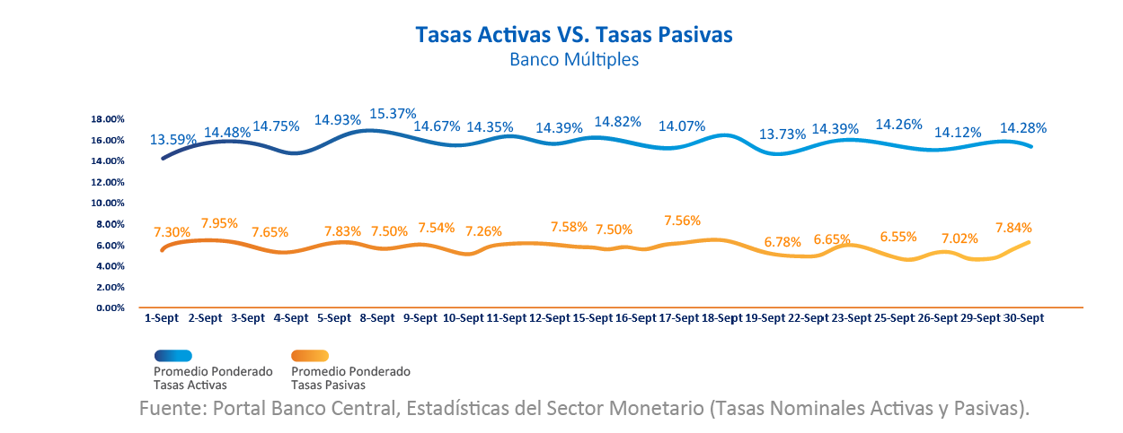 Por su parte, para los Bancos Múltiples, el promedio ponderado de las tasas activas, en el mes de septiembre cerró en 14.28%, mientras que el promedio ponderado de las tasas pasivas cerró en 7.84%: